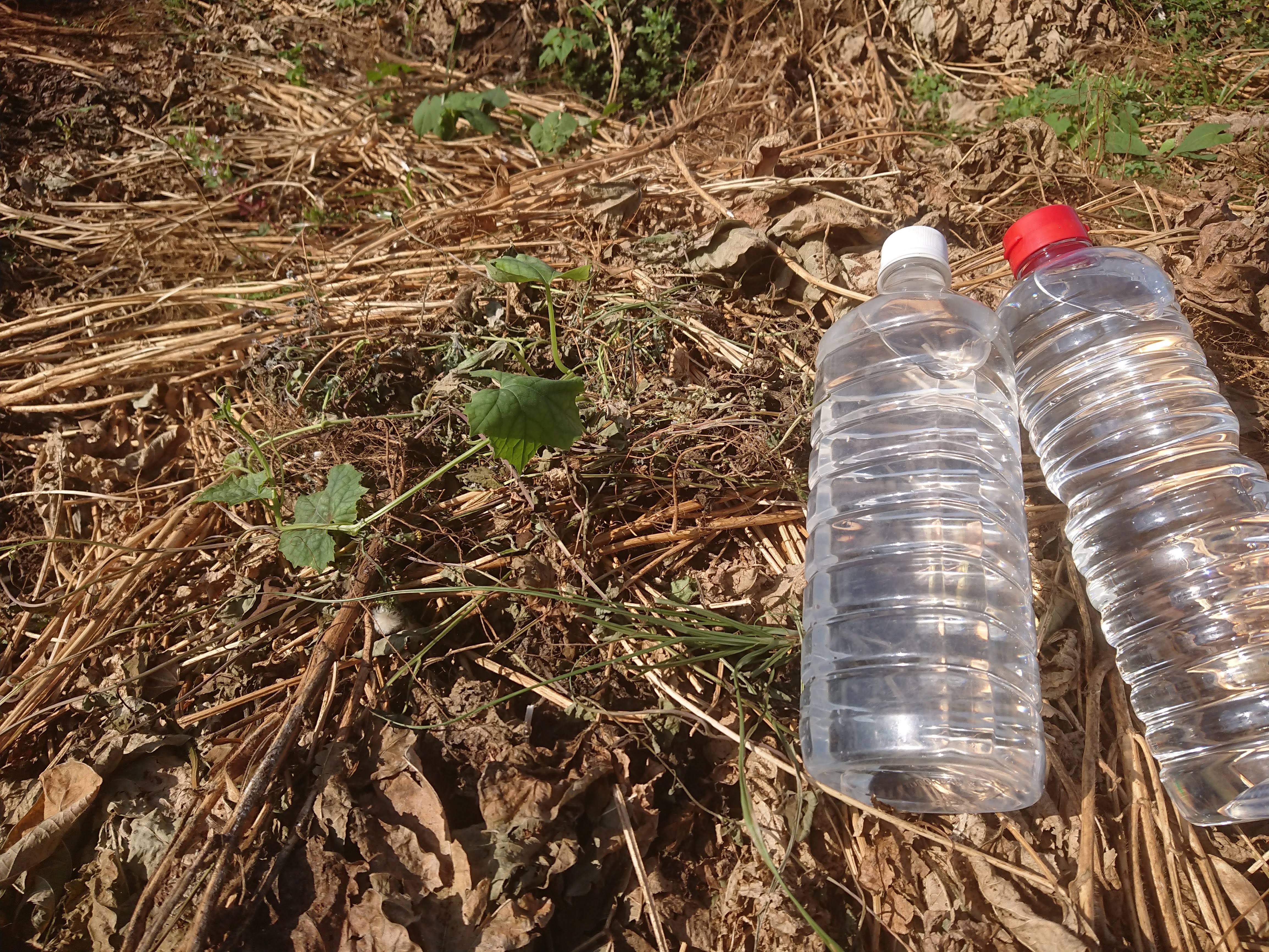 ▽本日も仕事の前に植え付けたヘチマに水やり。弱っている株があるので心配。ちょうど醤油がなくなったので空き容器を水やり用に導入。ペットボトル飲料は買うことがないので貴重です。ちなみに左のペットボトルは木酢液が入ってました。
